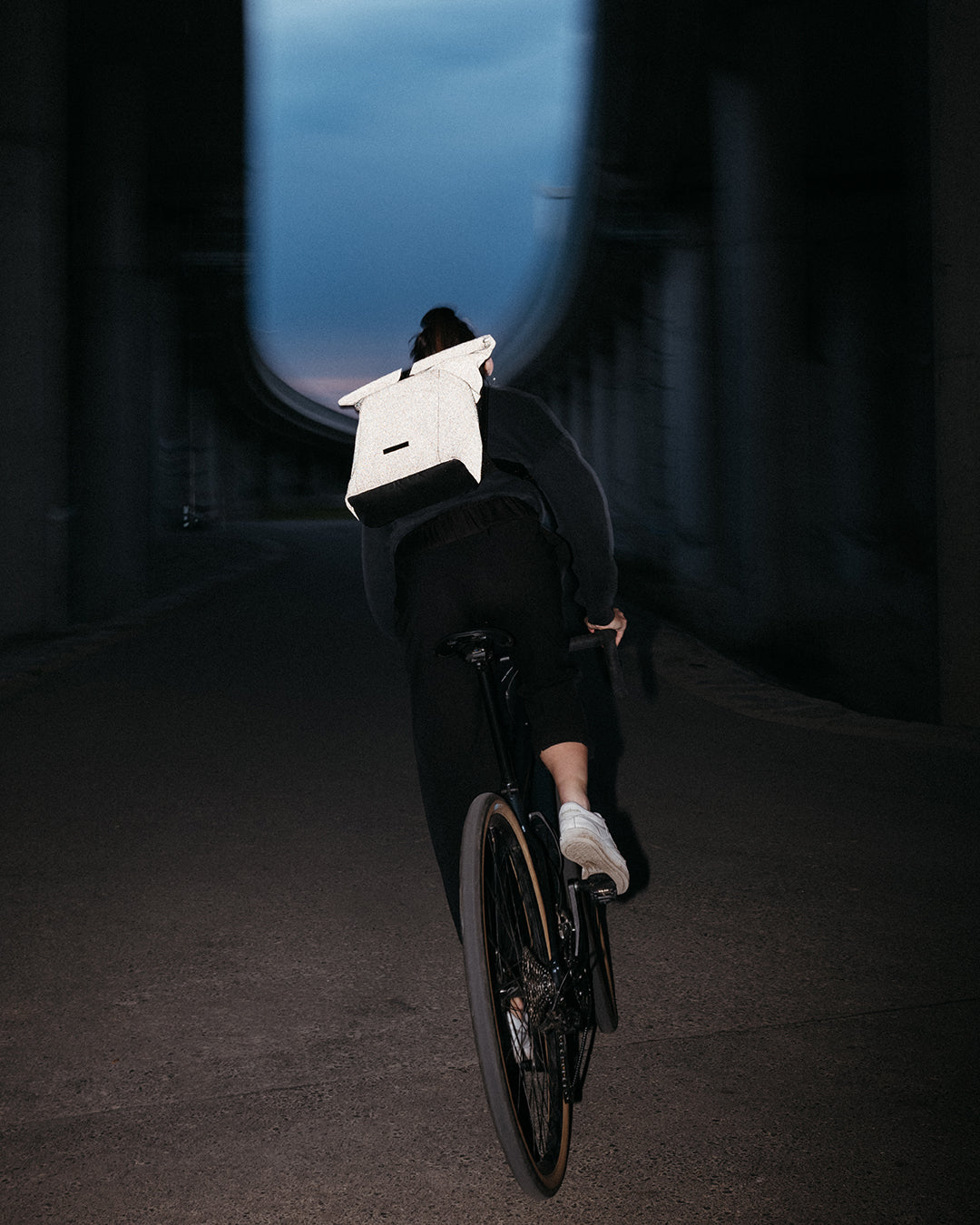 Die Phantom Series verfügt über ein eigens entwickeltes ECO-RFLX-900-Gewebe, das hohe Sichtbarkeit mit kompromissloser Nachhaltigkeit kombiniert. Durchzogen mit mikroskopischen Glaskugeln sorgt dieses innovative Material bei Nacht für hohe Reflektion – und hält dich sicher, wenn es am meisten zählt. Vollständig wasserdichtes Gewebe, das für alle Wetterbedingungen gemacht ist, diese Serie ist für das Leben in der Stadt in Bewegung entwickelt. Mit einem minimalistischen Design und gebaut für Funktionalität, ist es die nächste Generation verantwortungsbewusster Tragetaschen.