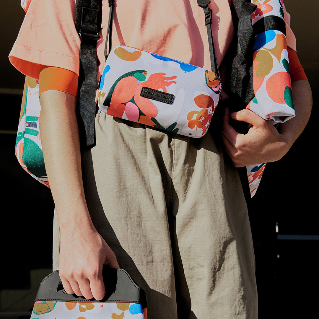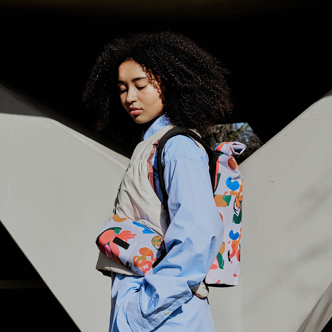 Das Hauptmaterial ist bei Nacht reflektierend, wurde aus recycelten Textilien hergestellt, anschließend im hochauflösenden Sublimationsverfahren bedruckt und entworfen von einem unserer meist geschätzten und talentierten Künstlerin. Amber Vittoria ist eine in New York City lebende Künstlerin und Dichterin. Ihr Entwurf für Ucon Acrobatics spiegelt ihren charakteristischen Stil mit abstrakten, fließenden Formen in Kombination mit kräftigen, leuchtenden Farben wider. Das Design ist sowohl spielerisch als auch dynamisch und verwendet organische Formen von abstrakten Personen, die sich in einer harmonischen und doch energiegeladenen Komposition verflechten. Die Farbpalette ist reichhaltig, mit kontrastreichen, aber dennoch komplementären Tönen von Grün, Orange, Pink und Blau, die ein visuell markantes Werk schaffen, das modern und ausdrucksstark wirkt.