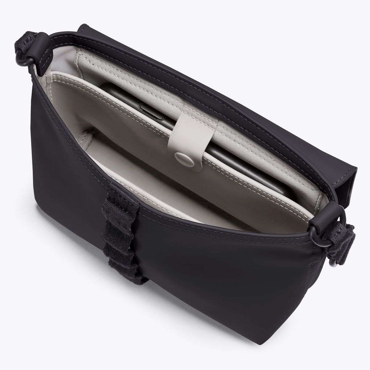Diese Umhängetasche ist ein cooler und zugleich sicherer Begleiter für Tag und Nacht. Yuri Bag schließt mit einem Klappverschluss, der mit einer Aluminiumschnalle gesichert wird. Im Innenraum gibt es genügend Platz für alle Essentials wie etwa Geldbeutel und Schlüssel und zwei weitere Innentaschen. Auf der Rückseite befindet sich eine Schnellzugrifftasche für das Smartphone. Dank des verstellbaren Schulterbands kann die Tasche bequem über der Schulter, als Umhängetasche oder lässig in der Hand getragen werden.